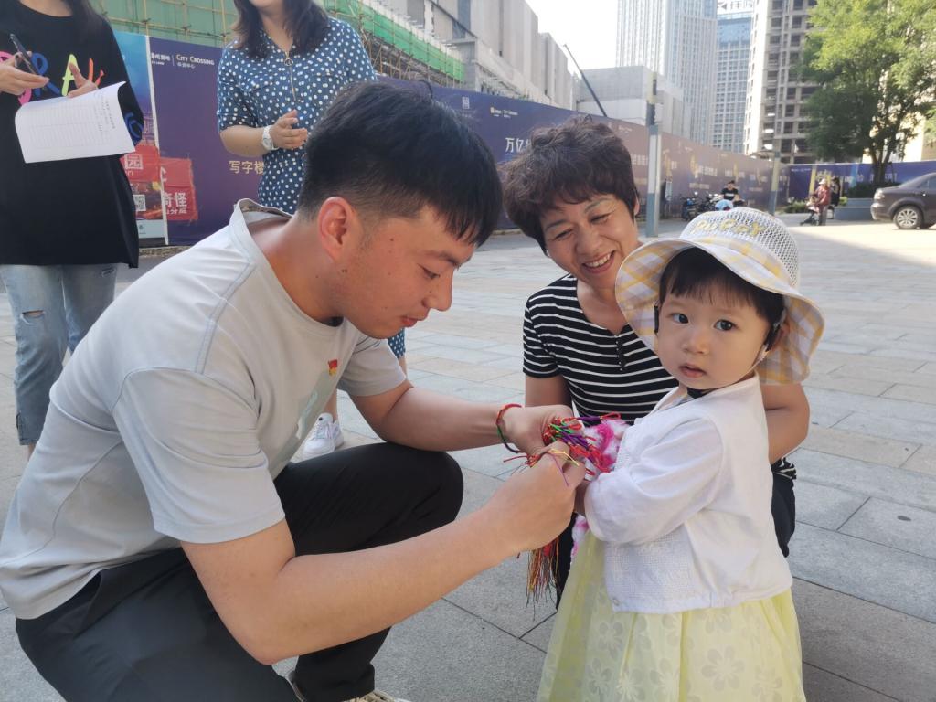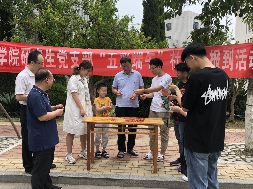 “轻汗微微透碧纨,明朝端午浴芳兰。流香涨腻满晴川,彩线轻缠红玉臂,小符斜挂绿云鬟,佳人相见一千年。”宋代词人苏轼的笔下,就曾出现了端午系五彩绳的习俗。为孩子系五彩绳是端午节的重要习俗,它有祈福纳吉的美好寓意。为了给华润社区的老人和孩子送上祝福,机电汽车工程学院于端午期间举行了“五彩端午”社区双报到活动。机电学院党总支书记唐斌、院长马国清、副院长于涛、组织员勇玲娥以及研究生党支部党员参与了本次活动。