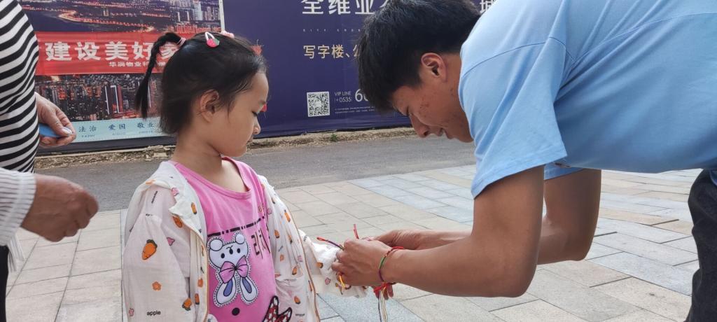 “轻汗微微透碧纨,明朝端午浴芳兰。流香涨腻满晴川,彩线轻缠红玉臂,小符斜挂绿云鬟,佳人相见一千年。”宋代词人苏轼的笔下,就曾出现了端午系五彩绳的习俗。为孩子系五彩绳是端午节的重要习俗,它有祈福纳吉的美好寓意。为了给华润社区的老人和孩子送上祝福,机电汽车工程学院于端午期间举行了“五彩端午”社区双报到活动。机电学院党总支书记唐斌、院长马国清、副院长于涛、组织员勇玲娥以及研究生党支部党员参与了本次活动。