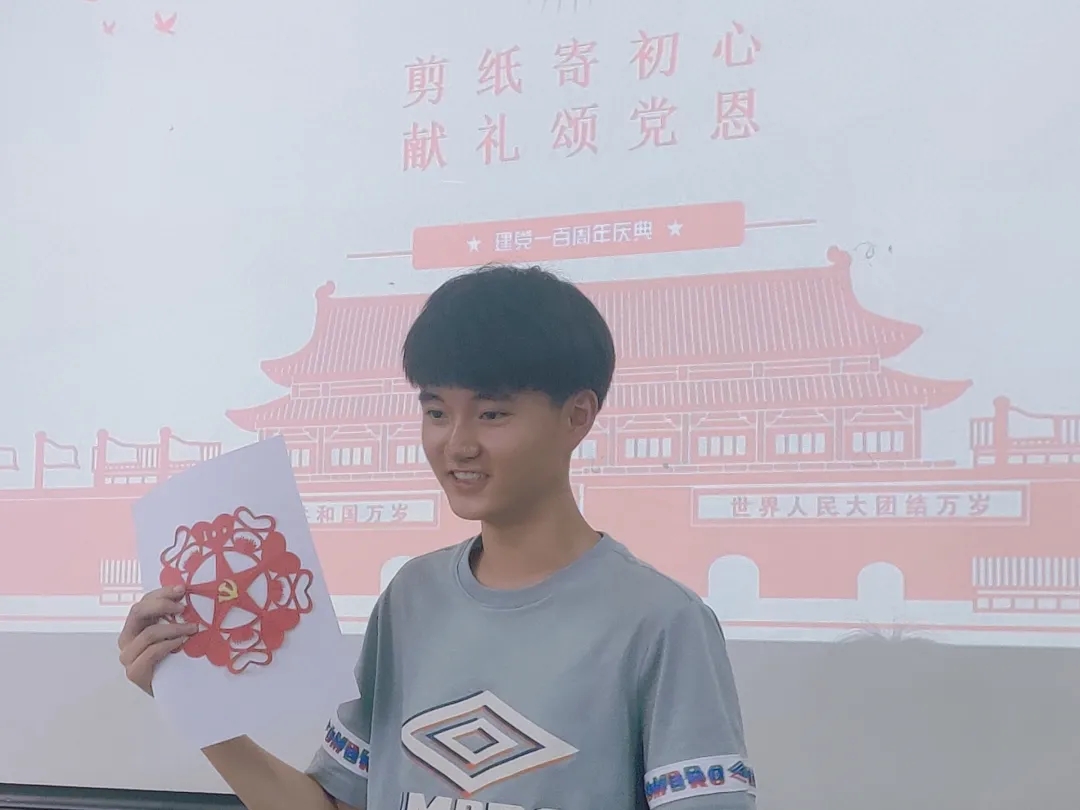 大赛伊始,主持人宣读了比赛规则,工作人员分发工具,剪纸大赛正式开始。同学们灵巧地操动剪刀,在鲜红的纸上游走,一个个生动的图案跃然呈现在眼前:南湖红船、党旗飘扬、杜鹃牡丹、改革开放、脱贫攻坚……一组组反映中国共产党百年来从无到有、艰苦奋斗的剪纸作品不断涌现。百年来的点点滴滴,从嘉兴红船上召开的中共一大,到党领导着中华民族赶跑侵略者,建立新中国,再到改革开放,决胜脱贫攻坚,实现中华民族伟大复兴的中国梦。中国共产党一路走来,披荆斩棘,克服了千难万险。热火朝天的创作阶段告一段落,随后是作品介绍环节。参赛同学手持作品,依次上台向评委老师和同学们介绍自己的作品。值得一提的是,杨楠同学所创作的《喜迎党百年》,以栩栩如生的燕子与寿桃形象,喜迎党的百年华诞,受到评委老师和同学们的喜爱,拿下本次剪纸大赛的一等奖。至此,剪纸大赛圆满结束。