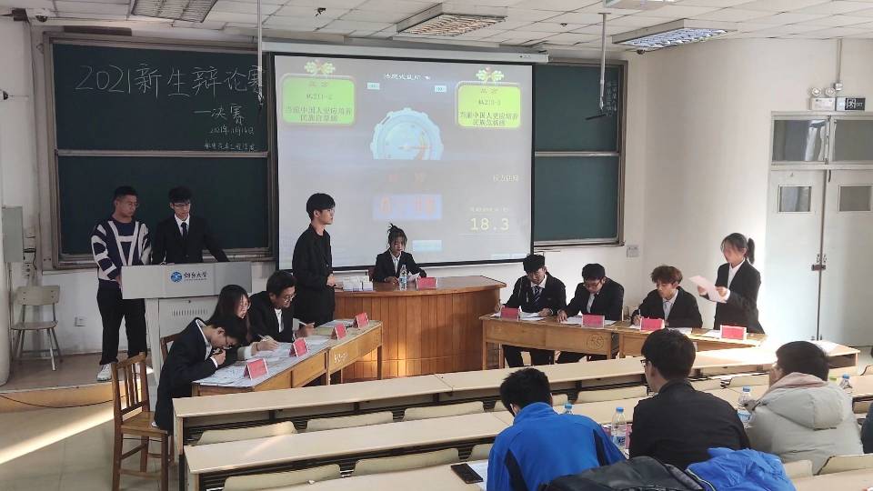 2021级新生辩论赛决赛在五教205室顺利举行。本次新生辩论赛决赛由机电汽车工程学院学生会学习部主办,四个班级进行冠军角逐。