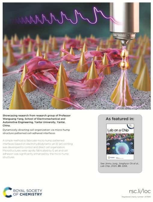 近日,国际著名学术期刊Lab on a Chip (中科院一区,TOP类期刊)以封面论文的形式邀请刊载了烟台大学机电学院面向生物医疗的跨尺度智能制造团队利用机器人化的微纳制造技术在组织工程领域的最新研究成果——Dynamically directing cell organization via microhump structure patterned cell-adhered interfaces,时隔2个月,该研究团队成果再获国际著名学术期刊封面刊载,机电学院杨文广老师为该研究论文的第一和通信作者。