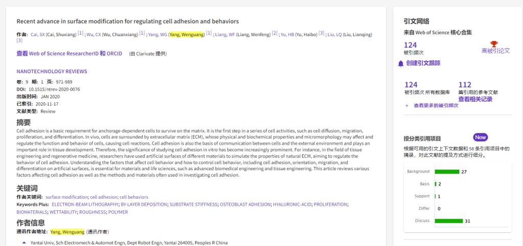 根据Essential Science Indicators(简称ESI)2023年1月公布的最新统计结果,我院教师杨文广老师发表于《NANOTECHNOLOGY REVIEWS》的论文《Recent advance in surface modification for regulating cell adhesion and behaviors》入选ESI高被引论文。该论文以91原创