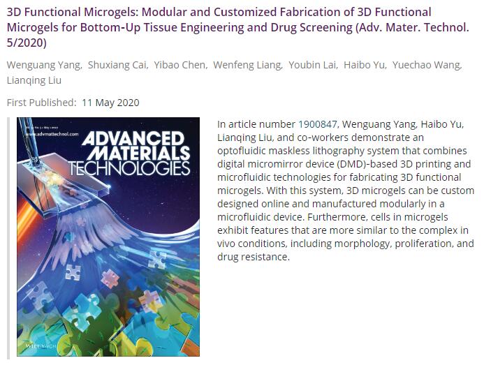 近日,国际著名学术期刊Advanced Materials Technologies以封面论文的形式刊载了烟台大学机电学院面向生物医疗的跨尺度智能制造团队利用机器人化的微纳操控和组装技术在组织工程领域的最新研究成果——Modular and Customized Fabrication of 3D Functional Microgels for Bottom-Up Tissue Engineering and Drug Screening,机电学院杨文广老师为该研究论文的第一和通信作者。