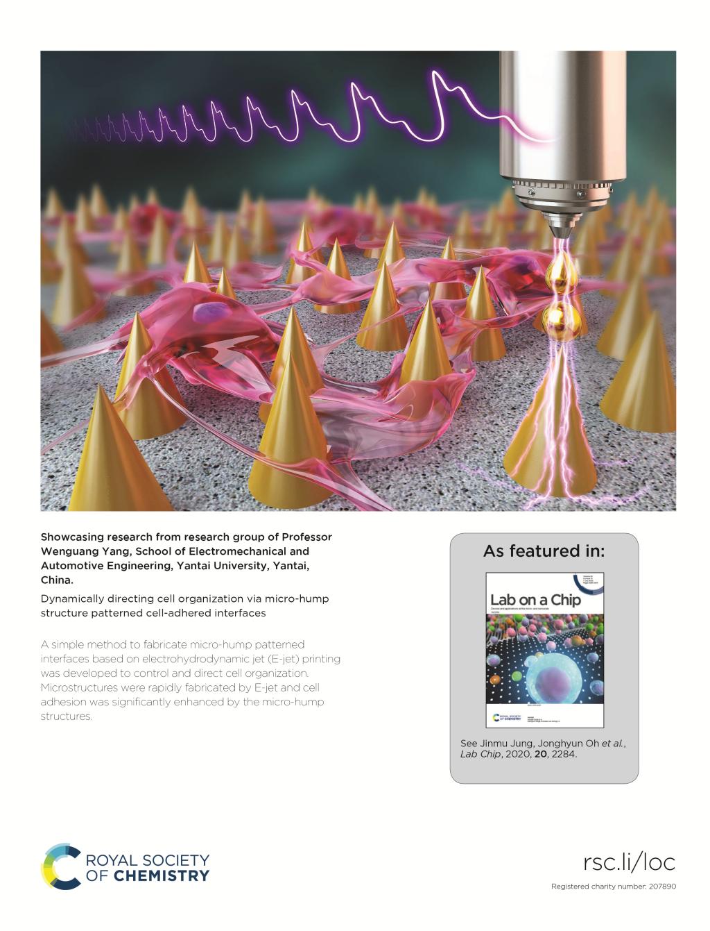 近日,国际著名学术期刊Lab on a Chip (中科院一区,TOP类期刊)以封面论文的形式邀请刊载了烟台大学机电学院面向生物医疗的跨尺度智能制造团队利用机器人化的微纳制造技术在组织工程领域的最新研究成果——Dynamically directing cell organization via microhump structure patterned cell-adhered interfaces,时隔2个月,该研究团队成果再获国际著名学术期刊封面刊载,机电学院杨文广老师为该研究论文的第一和通信作者。